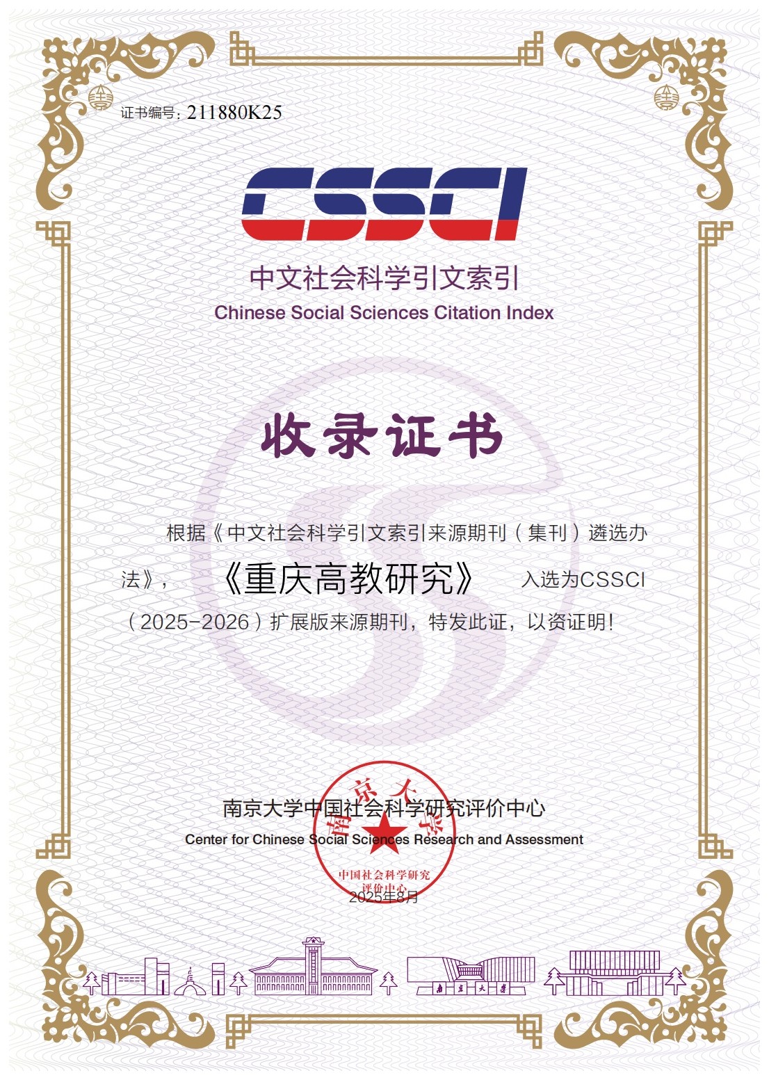 《重庆高教研究》再次入选CSSCI(2025-2026)扩展版来源期刊